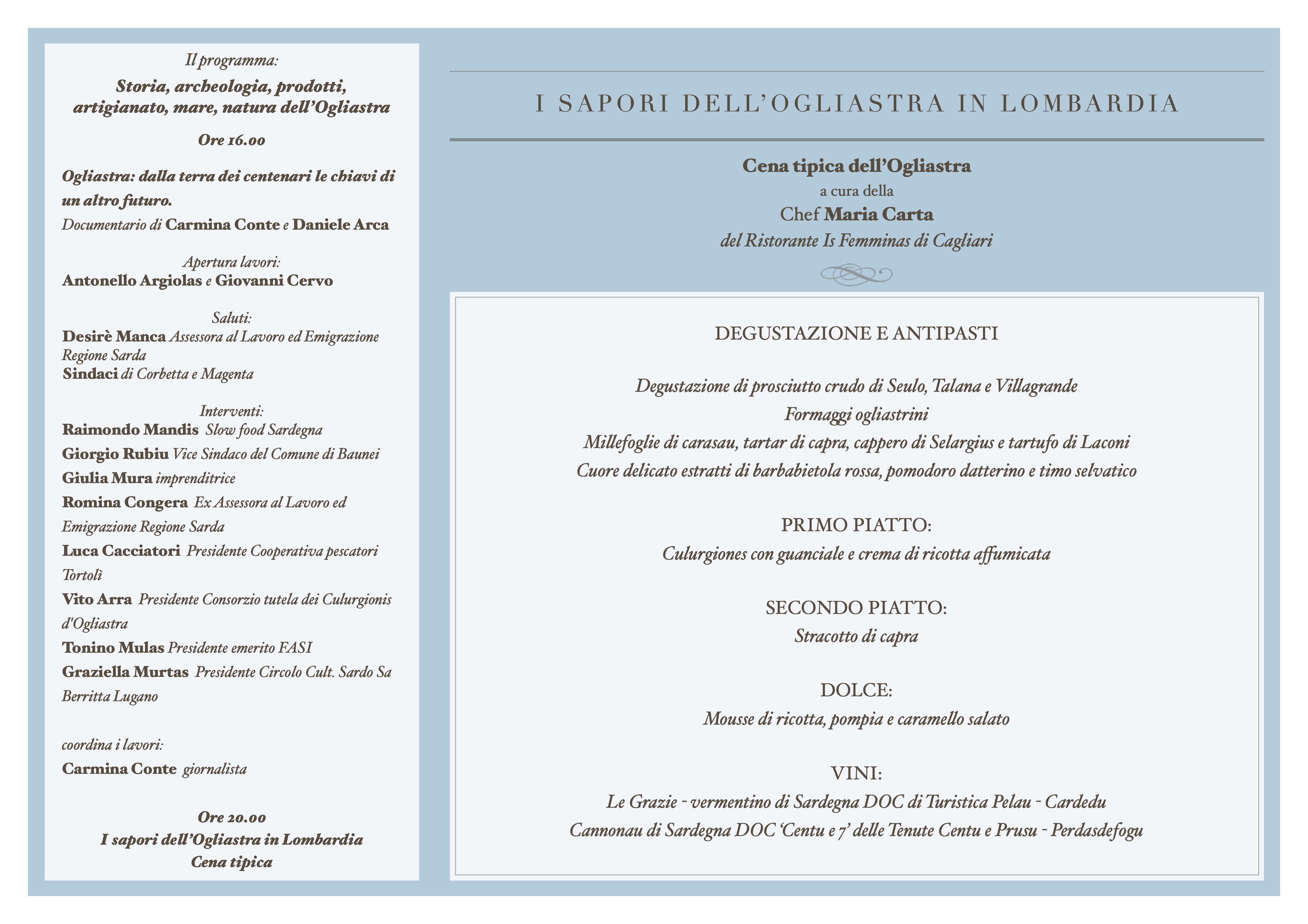 Seguirà il convegno con i saluti dei Sindaci di Corbetta e Magenta e gli interventi di: Raimondo Mandis Slow food Sardegna, Giorgio Rubiu Vice Sindaco del Comune di Baunei, Giulia Mura imprenditrice, Romina Congera ex Assessora al Lavoro della Regione Sardegna, Luca Cacciatori Presidente Cooperativa pescatori di Tortolì, Vito Arra Presidente Consorzio tutela dei Culurgionis d'Ogliastra, Tonino Mulas Presidente emerito FASI, Graziella Murtas Presidente Circolo Cult. Sardo Sa Berritta di Lugano. Coordina il lavori: Carmina Conte giornalista.