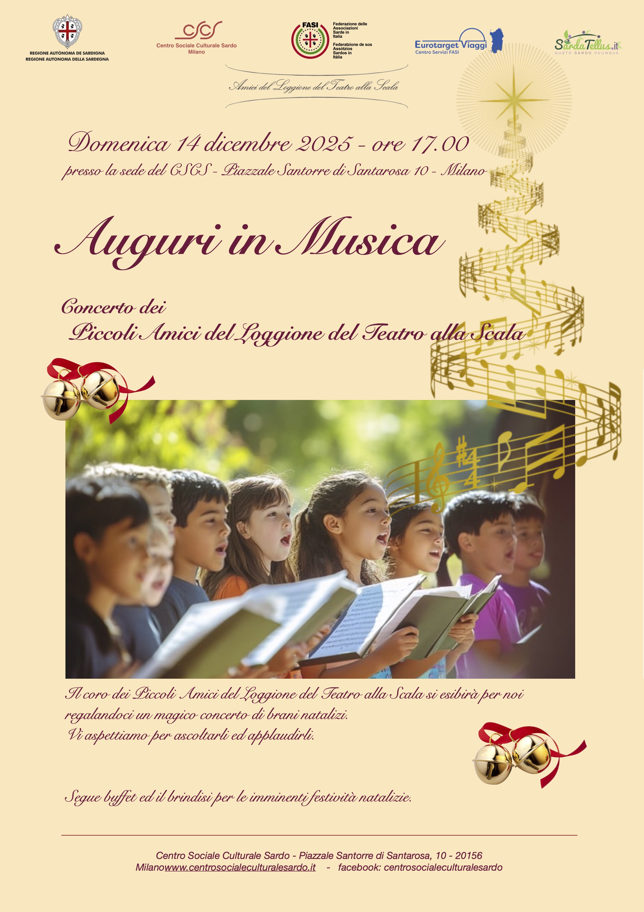 Domenica 14 dicembre alle ore 17.00 presso il Centro Sociale Culturale Sardo di Milano, si terrà il Concerto Auguri in musica con il coro dei "Piccoli Amici del Loggione del Teatro alla Scala" per lo scambio degli auguri in vista delle prossime festività natalizie.