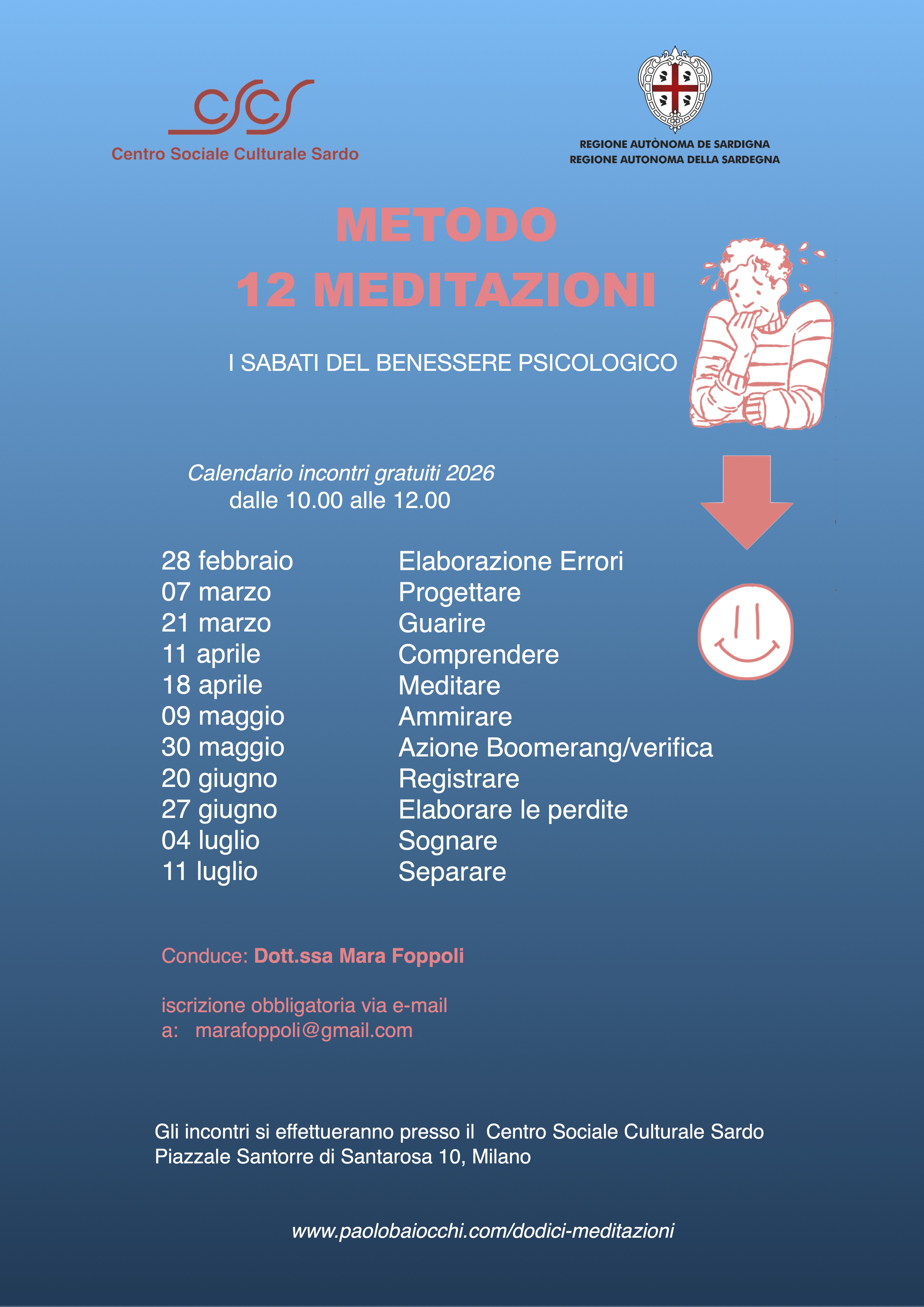 Riprendono al CSCS gli incontri "METODO 12 MEDITAZIONI" I sabati del benessere psicologico Attività Venerdì, 20 Marzo 2026 Anche quest'anno riprende con 11 incontri il corso della Dott.ssa MARA FOPPOLI. Saranno tenuti con la frequenza di 2 sabati al mese. Indietro Avanti