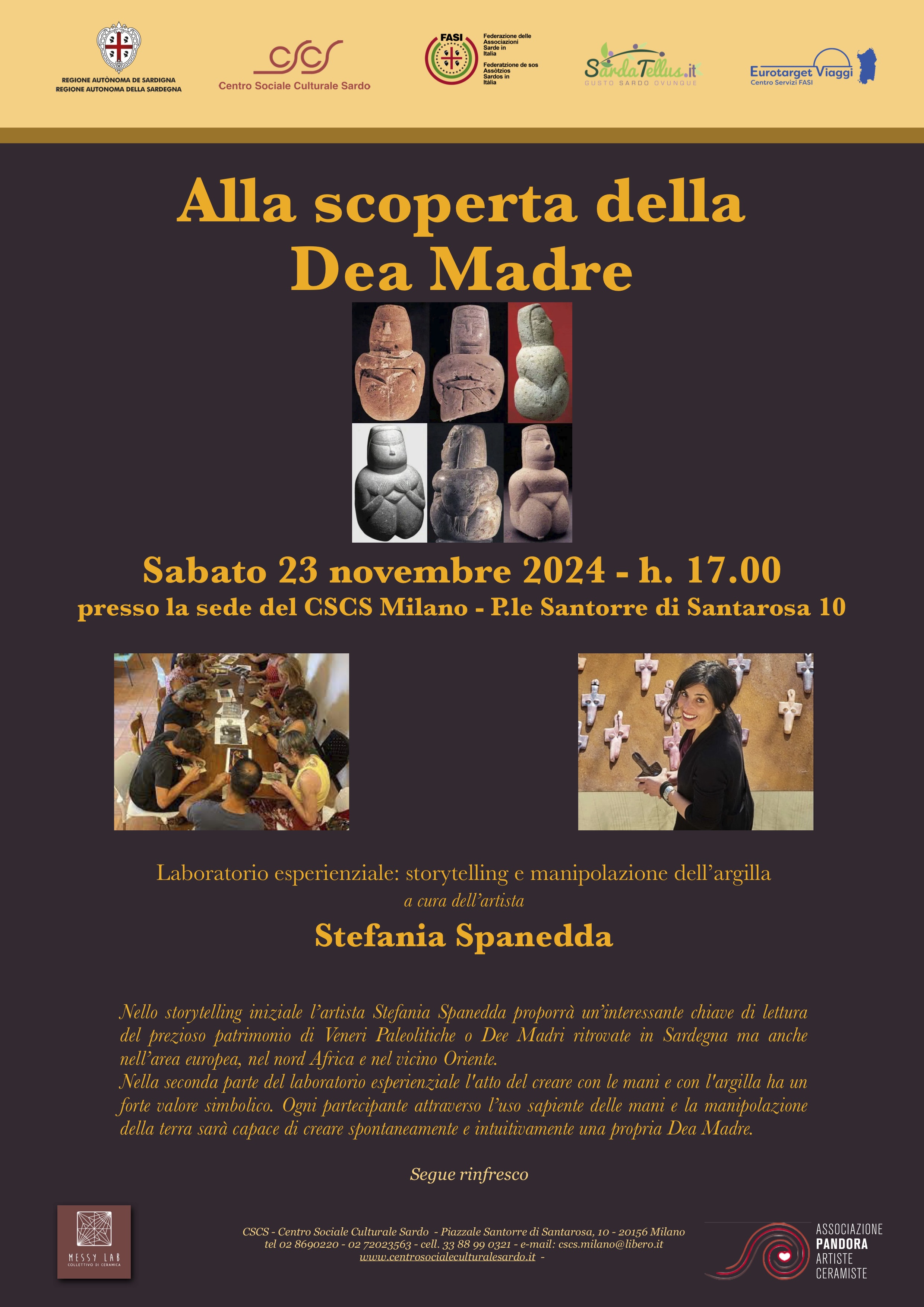 Ogni partecipante attraverso l’uso sapiente delle mani e la manipolazione della terra sarà capace di creare spontaneamente e intuitivamente una propria Dea Madre.